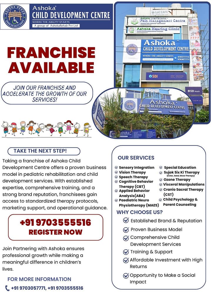 Are you passionate about making a difference in children’s lives while running a successful business? Join Ashoka Child Development Centre, Hyderabad’s leading pediatric rehabilitation and child development center. Our franchise model offers a lucrative opportunity to grow with us while positively impacting young minds.